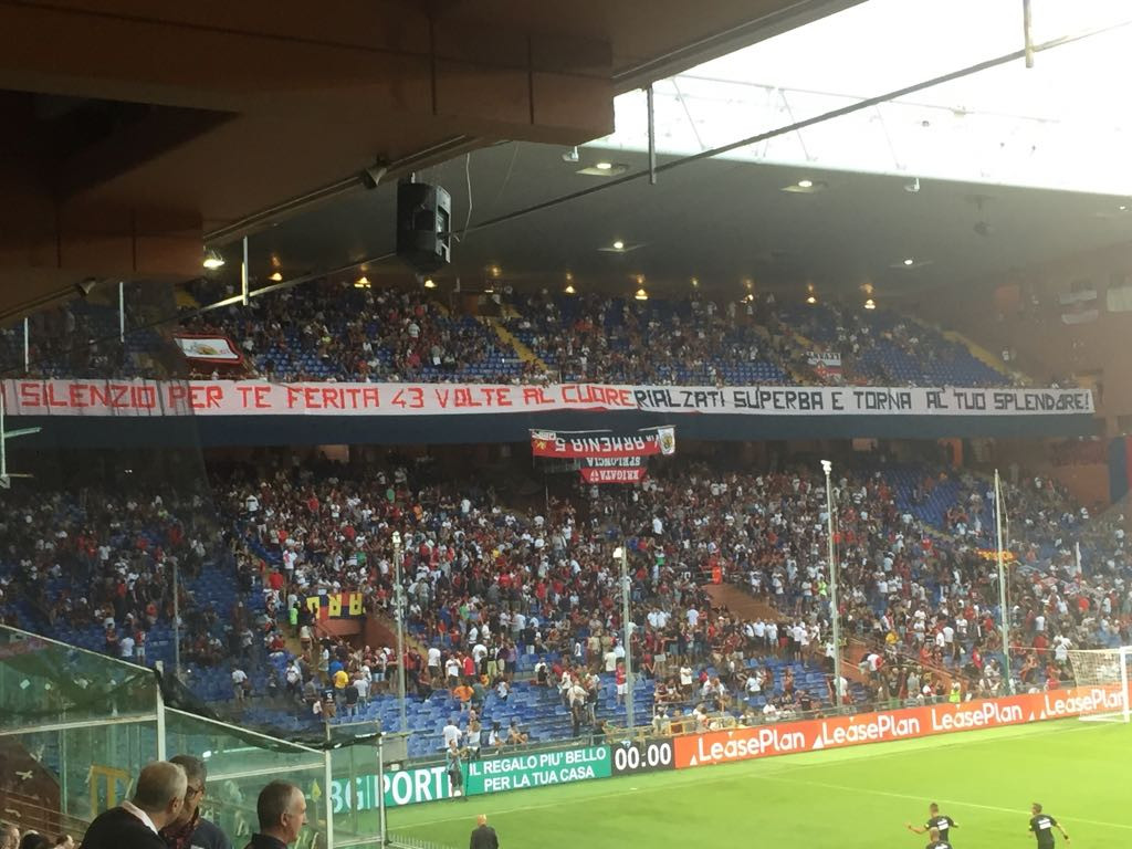“Silenzio per te, colpita 43 volte al cuore”, si legge sugli spalti. Si avvicina sempre più l’esordio del Genoa nella Serie A 2018-2019, con lo stadio Luigi Ferraris che, a pochi minuti dall’inizio della partita contro l’Empoli, tace in segno di rispetto. Striscioni coperti o capovolti, un’iniziativa da parte dei tifosi per ricordare le vittime del crollo del ponte Morandi: quarantatré minuti di silenzio, senza cori né bandiere al cielo, renderanno il silenzio protagonista nella prima frazione di gioco.