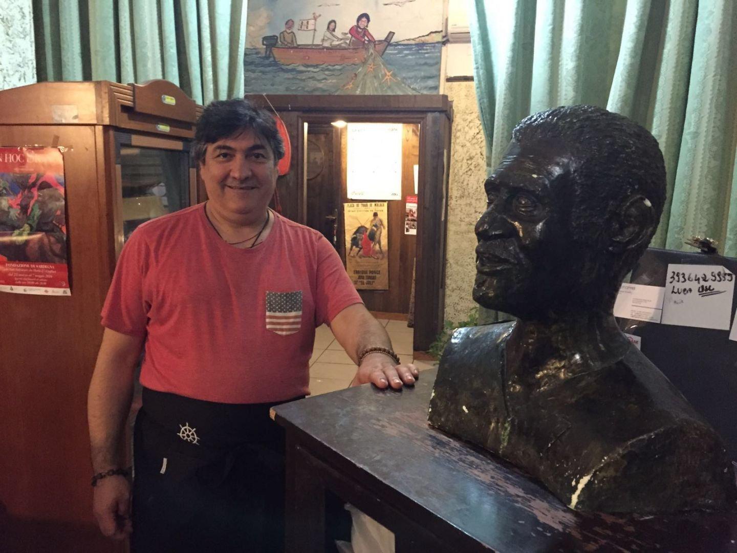 Nel locale, proprio accanto al tavolo fisso di Riva, c’è un busto in bronzo di Nenè – anche lui campione d’Italia con il Cagliari del ’70 – che Giacomo si è fatto fare tutto per sé. Insieme ad una pagina di giornale dell’epoca è uno dei tanti cimeli che fanno da arredo insieme alle foto con calciatori rossoblu di oggi e di ieri. “Quella di ristoratore è senza dubbio la mia prima passione, ma fare il calciatore non mi sarebbe dispiaciuto. Giocavo in porta, ma non mi sono mai fatto fare un tiro dal mio amico Gigi Riva”. Chissà, magari un giorno di questi potrebbe anche succedere: una gara di rigori tra i due con i palio, ovviamente, una bella porzione di triglie alla brace.