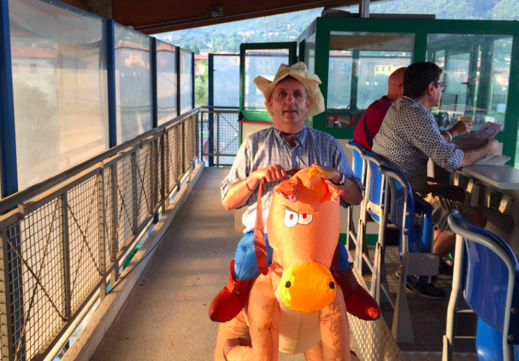Sembra un racconto fiabesco. Lo scenario, d’altronde, è quello giusto: il lago di Garda sullo sfondo, un promontorio che si affaccia sullo stadio (e le squadre in campo che si riscaldano). E poi, c’è lui il protagonista: tra un selfie e l’altro con i tifosi (anche della squadra ospite, perché no?), sfila pure sotto la tribuna stampa accompagnato da un nutrito gruppetto di bambini, incuriositi dalla ‘maschera speciale’.