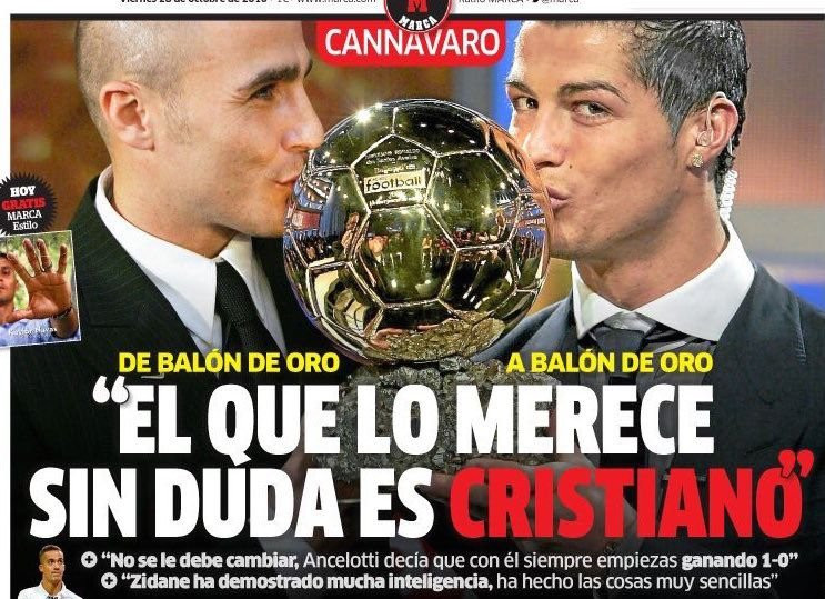 Fabio Cannavaro nella prima pagina di uno dei quotidiani spagnoli più importanti: Marca. In esclusiva. Il titolone è su Cristiano Ronaldo: “Si merita il Pallone d’oro, sicuramente. Per quello che ha vinto: Europeo, Champions. Ancelotti diceva che se hai Cristiano in squadra parti già con vantaggio di un gol a zero”. Ma l’attuale allenatore del neo promosso Tianjin ammette pure che “a Sergio Ramos non daranno mai un Pallone d’oro, perché ha Cristiano davanti. E’ la stessa ragione per cui non lo vince Iniesta. C’è Messi”. I tre centrali attualmente più forti del mondo? “Pepe, Ramos, Boateng”. Un commento su Piqué, nemmeno nella lista dei 30. “Non mi sorprende. Perché un difensore sia considerato da Pallone d’oro, deve garantire un rendimento costante. Lui alle volte cala, poi si riprende… insomma, gli manca regolarità”. Da quello che sarà a quello che è stato, Fabio Cannavaro racconta. “Il giocatore più complicato che io abbia mai marcato… Ronaldo, il Fenomeno. Era un pericolo costante, dovevo pregare quando ce l’avevo davanti”. Messi? “Ho giocato anche contro di lui. Devi sperare che sbagli e non cercare di fermarlo”.