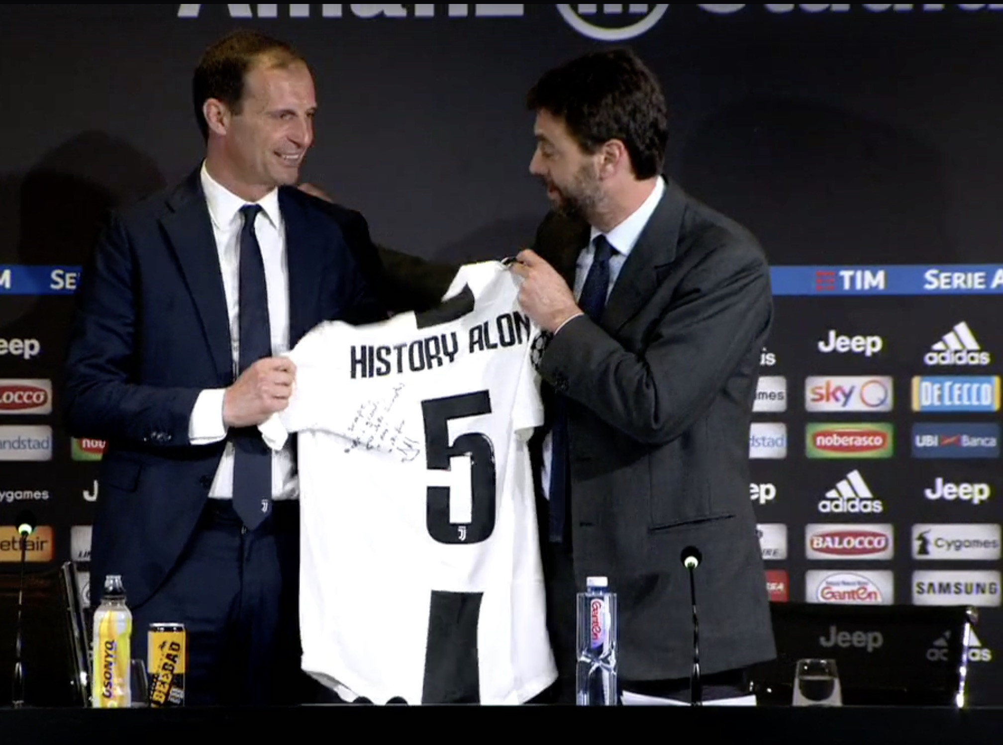 Segno di un gruppo che all’allenatore vuole bene e che sa che l’impronta di questi cinque anni di successi è anche sua. “Ma quanta gente è venuta oggi?”, dice. Poi, scherza. Prende di mira soprattutto Barzagli, che dà l’addio al calcio e riceve un’investitura non da poco: “È già in rampa di lancio per diventare allenatore”. “Max”, così lo chiama anche il suo presidente, riceve una maglia che si tiene stretta. Di solito si dà all’inizio di un percorso, questa volta alla fine: History Alone.