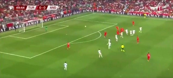 A inizio secondo tempo, infatti, una punizione dalla sinistra battuta da Emre ha visto la linea difensiva di Andorra scappare velocemente in avanti con l'obiettivo di lasciare gli avversari in fuorigioco. Il risultato è stato quello di lasciare quattro giocatori turchi in posizione regolare e soli davanti al portiere. Per fortuna di Andorra, il capitano Lima è riuscito a recuperare in tempo ed evitare il gol di Caglar con un salvataggio sulla linea spettacolare.