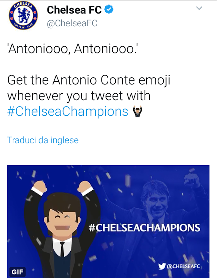 Antonio Conte: uomo dei record anche sui social. Un titolo conquistato contro ogni pronostico di inizio stagione. Una festa iniziata in campo e proseguita sul web! Perché a gridare ‘Chelsea Champions!’ non sono stati solo i tifosi allo stadio, o quelli che hanno colorato di Blue le vie di Londra. Basta mettere un hashtag davanti e l’emozione diventa virtuale: 140 caratteri, o anche meno, per celebrare questo titolo ovunque e… veder comparire un piccolo Antonio Conte che esulta vicino a quel #ChelseaChampions. Braccia al cielo ed ecco che il manager italiano diventa un’emoji. Virtuale, virale. Un po’ come l’iniziativa che lui stesso, da ct dell’Italia lanciò l’estate scorsa ai tifosi: “Tutti con la maglia azzurra”. Un invito raccolto anche dal web, perché anche i social dopo quell’appello si sono davvero tinti di azzurro.