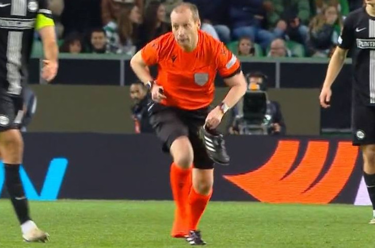 E la scarpa dell’arbitro scozzese William Collum è volata via dopo uno scontro avvenuto in mezzo al campo con il capitano dello Sturm Graz, Jon Gorenc Stankovic. Ma il gioco non si ferma. Così il direttore di gara non ci ha pensato due volte: ha raccolto la scarpa recuperando subito i metri per rimanere attaccato al treno dell’azione.