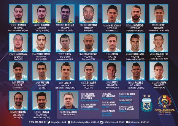 Questo l’elenco completo dei 23 convocati di Martino: Sergio Romero (Manchester United), Nahuel Guzmán (Tigres), Mariano Andújar (Estudiantes); Facundo Roncaglia (Fiorentina), Marcos Rojo (Manchester United), Nicolás Otamendi (Manchester City), Ramiro Funes Mori (Everton), Víctor Cuesta (Independiente), Jonathan Maidana (River), Gabriel Mercado (River); Javier Mascherano (Barcellona), Augusto Fernández (Atlético Madrid), Matías Kranevitter (Atlético Madrid), Éver Banega (Sevilla), Lucas Biglia (Lazio), Erik Lamela (Tottenham), Javier Pastore (Paris Saint Germain); Nicolas Gaitan (Benfica), Lionel Messi (Barcellona), Gonzalo Higuaín (Napoli), Sergio Agüero (Manchester City), Ángel Di María (Paris Saint Germain), Ezequiel Lavezzi (Hebei Fortune).