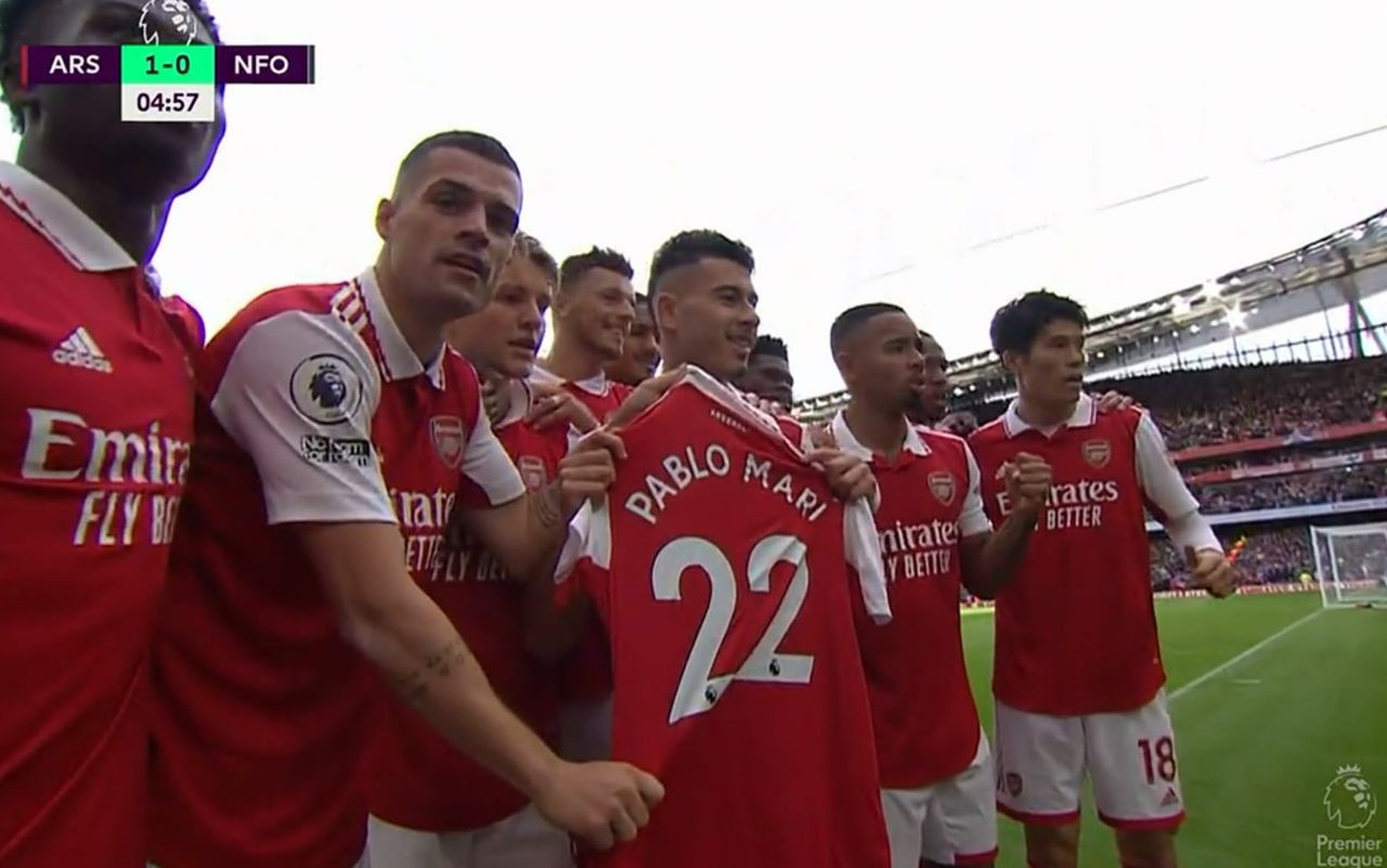 Il giovane esterno brasiliano ha deciso di esultare andando proprio a prendere la maglia numero 22 di Pablo Marì, con tutta la squadra che si è unita a lui nella celebrazione. Bellissimo gesto da parte dell’Arsenal che ha voluto ricordare il loro ex compagno, mandando un messaggio di solidarietà dopo quanto successo nei giorni scorsi.