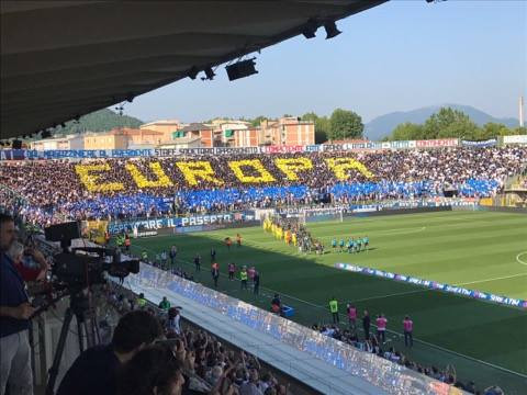 Un’Europa conquistata 26 anni dopo l’ultima partecipazione alla Coppa Uefa, una stagione esaltante che ha permesso all’Atalanta di realizzare il sogno dei tifosi bergamaschi. Oggi con il Chievo l’ultima di campionato, per festeggiare un traguardo insperato e, perché no, sognare di raggiungere il quarto posto Lazio permettendo. La Curva Nord ha accolto le squadre in campo con una splendida coreografia fatta di migliaia di cartoncini che hanno composto la scritta “Europa”. Più in alto uno striscione: “Dal magazziniere al presidente, staff societario appassionato e competente, fate grande l’Atalanta in tutto il continente”.