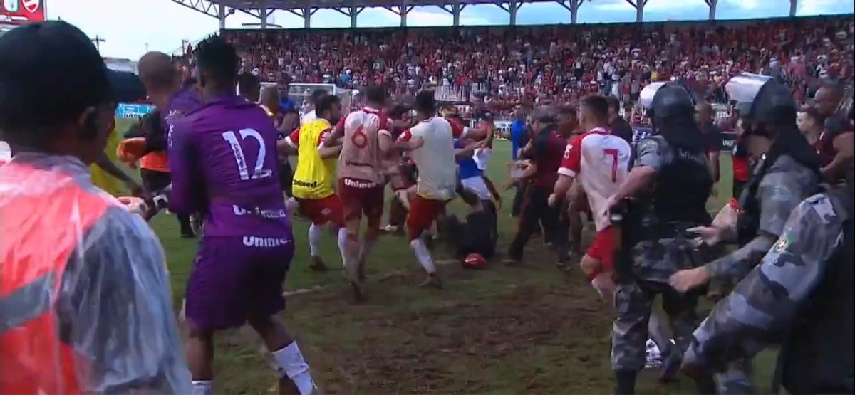 Una volta riportato l'ordine la polizia ha fermato in stato d'arresto e portato via per essere interrogati: tre calciatori del Vila Nova, Rafael Santos, Keke' e Patrick, e il preparatore atletico Renan Lima. Per l'Atletico, invece, sono stati fermati il dirigente Junior Murtosa e l'addetto stampa Leo Roque. Scene di guerriglia urbana su un campo di calcio e ad avere la peggio non è stato uno dei calciatori, ma il fotografo ufficiale dell'Atletico Goianense, Paulo Marcos, che è rimasto a terra con una gamba fratturata.