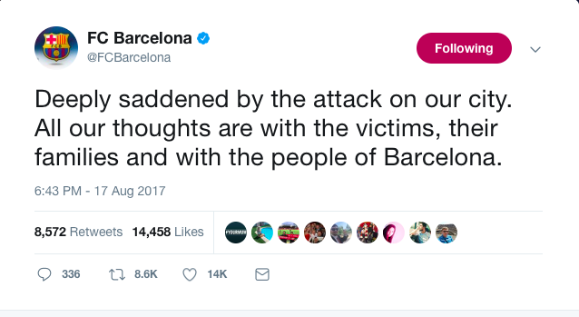 Il mondo del calcio si è stretto vicino al popolo catalano e alla città di Barcellona. Sono tanti i messaggi comparsi sui social di club spagnoli e stranieri, oltre che a quelli personali dei giocatori. “Profondamente tristi dall’attacco alla nostra città. Tutti i nostri pensieri sono con le vittime, le loro famiglie e con il popolo di Barcellona” il tweet della squadra blaugrana. Cordoglio anche da parte del Real Madrid, espresso tramite il proprio sito ufficiale: “Il Real Madrid C. F. mostra la sua costernazione più profonda per l’attacco accaduto nella città di Barcellona e la propria solidarietà alle vittime e alle loro famiglie e amici, augura una pronta guarigione ai feriti”, e dal Psg: “In questo tragico giorno, i nostri pensieri vanno alle vittime, alle loro famiglie e ai nostri amici. Noi siamo con voi”.