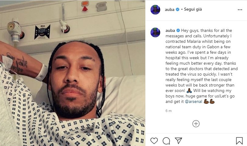 Pierre-Emerick Aubameyang ha la malaria. L'attaccante dell'Arsenal, con un messaggio su Instagram, ha spiegato che ha contratto il virus durante la sosta per le nazionali, quando era lontano da Londra con il suo Gabon.
