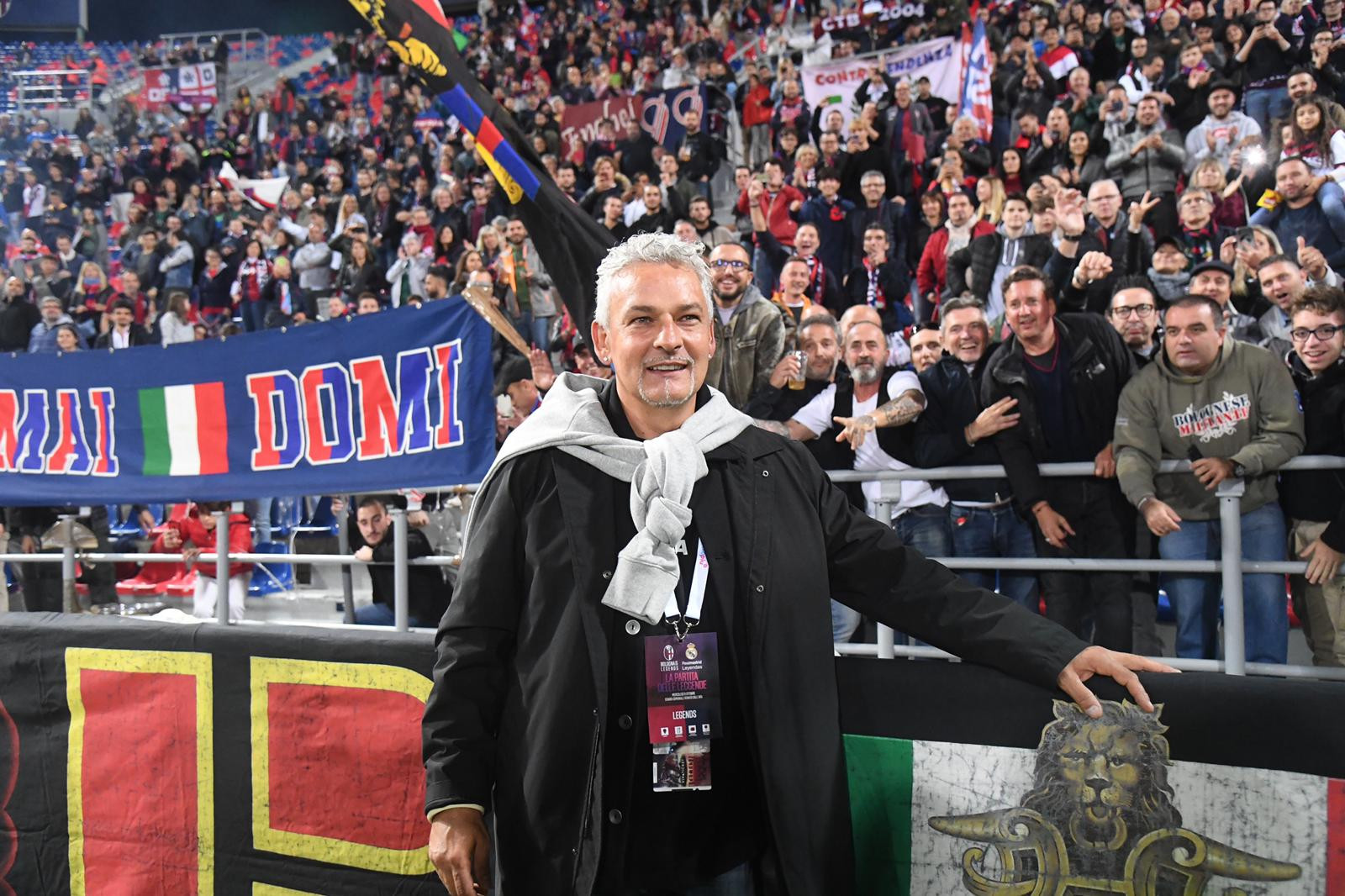 E mentre gli altri stavano giocando contro il Real Madrid Leyendas, Baggio ha voluto fare un saluto da solo alla curva insieme a un altro bomber della storia rossoblu, Beppe Signori.