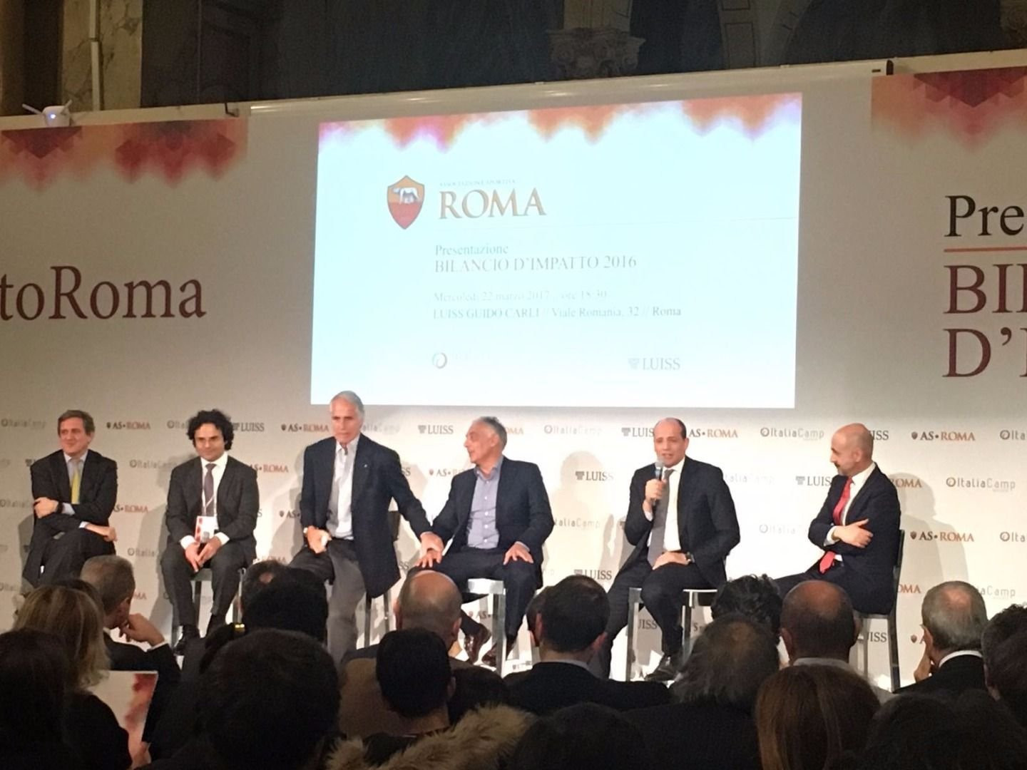 All’università LUISS, la Roma presenta il Bilancio d’Impatto 2016: la prima esperienza di misurazione della propria capacità di generare impatto sociale da parte di una società calcistica. Presenti all’evento, oltre al presidente CONI Giovanni Malagò, anche il presidente della Roma James Pallotta e il direttore tecnico Mauro Baldissoni, il primo a prendere la parola: “Come detto da Pallotta, noi siamo i custodi del Club, non i proprietari. La Roma è una piattaforma sociale che fa riferimento ad una comunità. Dobbiamo rappresentare i valori che la Roma rappresenta, deve essere questo il nostro obiettivo. Abbiamo accettato la sfida di Italia Camp e LUISS per valorizzare il nostro impegno nella città di Roma”.