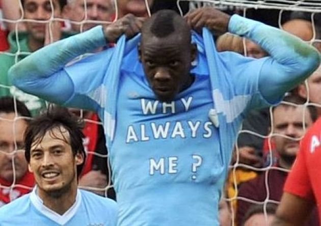 Mario spiega perché scelse di scrivere “Why always me?” nella canottiera sotto la maglia da gara: “Fu semplicemente uno scherzo. Alla fine, pur fra qualche eccesso, non penso di meritare tutte queste attenzioni, nel bene e nel male. Si è creato questo personaggio, non mi è permesso di fare niente in più e in meno. Non sono ipocrita: ci resto male quando finisco sui giornali se combino qualcosa, ma non mi piace nemmeno quando si esagera in positivo. Balotelli segna due gol? Un fenomeno. Vorrei essere solo un calciatore come gli altri, magari un po’ più bravo degli altri. Balotelli è il calciatore. Poi Mario è un’altra cosa. È più facile descrivere Balotelli che Mario. Balotelli è un personaggio creato dai giornali: quello che sorride o non sorride, fa una grande giocata, sbaglia un rigore, non esulta. E viene giudicato da quelli che lo guardano giocare. Mario è un ragazzo di 25 anni che non può avere una vita normale ma ci prova, passando il tempo con sua figlia quando è possibile, con gli amici, la famiglia, la PlayStation. Ai miei amici ogni tanto dico: quanto darei per fare una settimana io te e tu me. Basta che non mi crei casini…”.