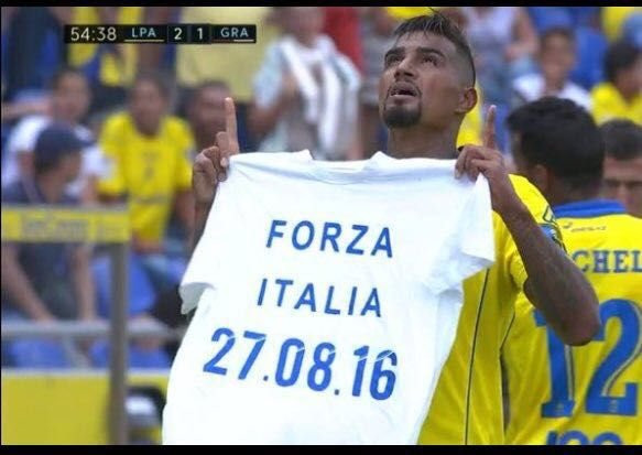 Seconda giornata di Liga e seconda vittoria per Las Palmas. La settimana scorsa contro il Valencia, oggi contro il Granada (5-1). Punteggio pieno e una costante: il gol di Kevin Prince Boateng. Arrivato nel club spagnolo in questa sessione estiva di calciomercato, Boateng è andato a segno nelle prime due uscite della squadra. Oggi ha firmato il gol del 2-1 ed ha festeggiato con una dedica speciale: maglietta commemorativa per un pensiero alle vittime del sisma che ha colpito il centro Italia nella notte del 24 agosto. “Forza Italia 27.08.16”, il messaggio rivolto alle popolazioni terremotate da parte di Boateng che in Italia ha trascorso tre stagioni e mezzo della sua carriera.