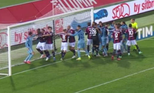 L’arbitro Massa ha cercato di calmare gli animi dopo i contatti iniziali, ma proprio in quel momento è partita una rissa che si è protratta dentro la porta difesa da Skorupski con tutti i giocatori di fatto protagonisti.