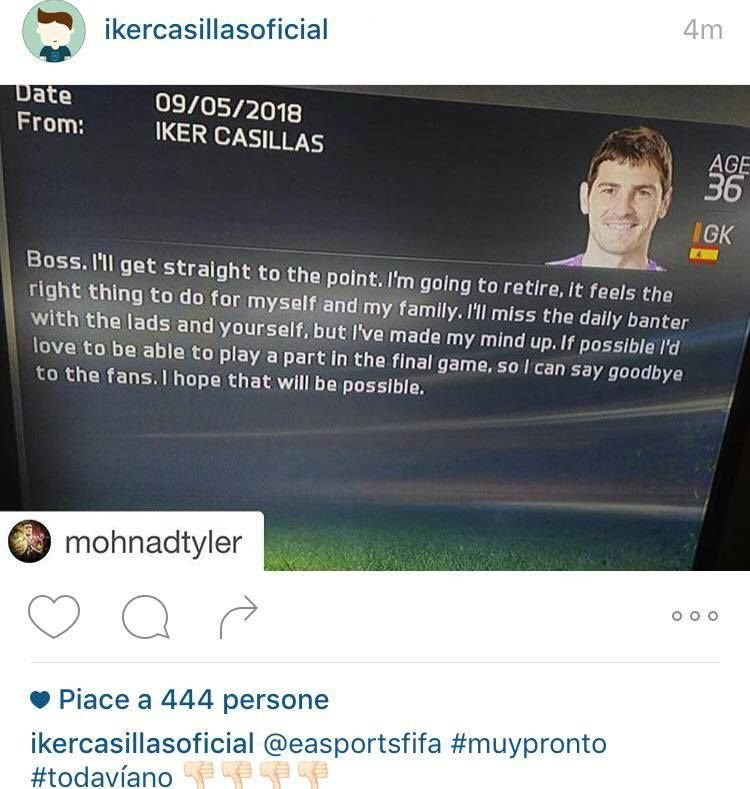 Parole di? Iker Casillas. Che quindi si ritira per davvero? Com’è possibile? Quando? Ah allora il mercato non finisce mai! Poi lo sguardo ricade sulla data in alto della schermata e… 09/05/2018. Età: 36 anni. Qualcosa non torna. O meglio, se si facesse più attenzione, ecco il motivo. Il portiere del Porto – ex capitano del Real – reposta sul proprio profilo Instagram la foto di questo tale @mohnadtyler e nel commento ci scrive ironicamente: #moltopresto #ancorano con tanto di tag a @easportsfifa. Nessuno scherzo, non c’è gioco che regga. Iker non appende i guantoni al chiodo, non ora almeno. E sul fatto che Casillas non ne abbia alcuna intenzione lo si è capito bene…