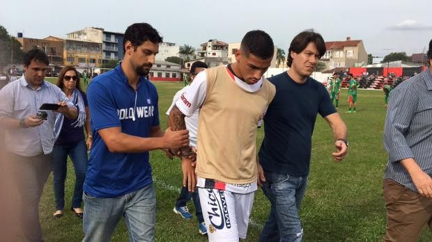 Arrestato in campo, davanti ad avversari e compagni increduli. E’ accaduto in Brasile a Marlon Natanael de Lima Alexandre, 21 anni, giocatore della Sapucainese, squadra di seconda divisione, durante la partita del Campionato Gaucho contro la Farroupilha. L’accusa è di sequestro di persona e l’arresto è avvenuto nel bel mezzo della partita, mentre Marlon era in panchina. La Sapucaiense, estranea ai fatti, ha collaborato all’arresto del suo tesserato. Marlon aveva quattro mandati di arresto in sospeso e la polizia brasiliana non riusciva a risalire al suo indirizzo: il giocatore si preparava alla fuga. Il ventunenne non è nuovo a queste “imprese” visto che era già stato arrestato per furto di un veicolo in passato. L’attaccante ha negato ogni accusa di fronte ai giornalisti.
