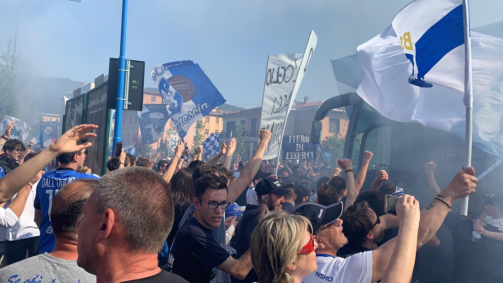 Potrebbe essere una grande festa, per ora è una grande, grandissima carica. I tifosi del Brescia accolgono così il pullman della squadra, che oggi con l'Ascoli si gioca la promozione in Serie A. Le rondinelle, infatti, battendo i bianconeri risulterebbero matematicamente promossi, visto il pareggio di oggi del Palermo. Fumogeni, cori, clima caldissimo. A Brescia c'è voglia di grande calcio: la festa è (quasi) pronta. Ecco le foto.