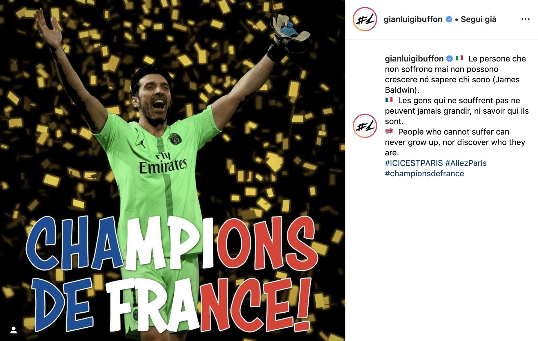 "Le persone che non soffrono mai non possono crescere né sapere chi sono". Decide di citare Baldwin Gigi Buffon. Lo fa su Instagram. per festeggiare a 41 anni un altro scudetto vinto. Questa volta in Francia. Il numero 8 consecutivo per lui, l'ottavo anche per il PSG nella sua storia. La delusione per la mancata Champions è superata, ma la voglia di vincere ancora c'è. Così, il portiere ha deciso di affidare ai Social Network il suo pensiero: una frase chiara, che apre già al futuro. Il suo parla ancora francese.