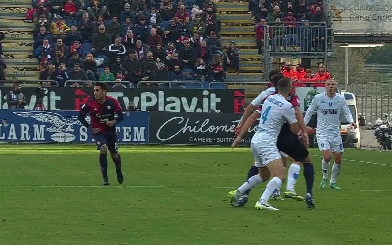 La decisione di campo di Maresca è di lasciar correre sul primo contatto e di fischiare il secondo, ammonendo l’esterno del Cagliari. I giocatori dell’Empoli chiedono un provvedimento più severo, un rosso. Il VAR evidentemente è dello stesso avviso, e richiama Maresca per la valutazione del DOGSO: secondo Paterna la direzione, la distanza dalla porta, il numero di difensori e il possesso del pallone determinano una chiara occasione da gol.