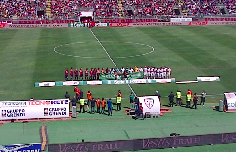 Tutto pronto per la festa a Cagliari, ma prima c’è da battere il Livorno, nella speranza che dagli altri campi arrivino buone notizie. Il Sant’Elia sceglie l’abito migliore per accogliere i rossoblù. Tutto esaurito da giorni, grande atmosfera e colpo d’occhio degno della Serie A. Rastelli cerca di stupire tutti da subito: 3-5-2 con i terzini Balzano e Murru spostati nella linea di centrocampo. Per Gelain necessità assoluta di punti e modulo molto abbottonato con un’unica punta, il bomber Vantaggiato, che colpì all’andata.
