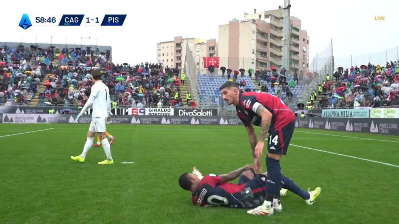 Il centrocampista del Cagliari ha pareggiato la rete di vantaggio del Pisa con un tuffo di testa. Nella caduta ha sbattuto il ginocchio contro il palo