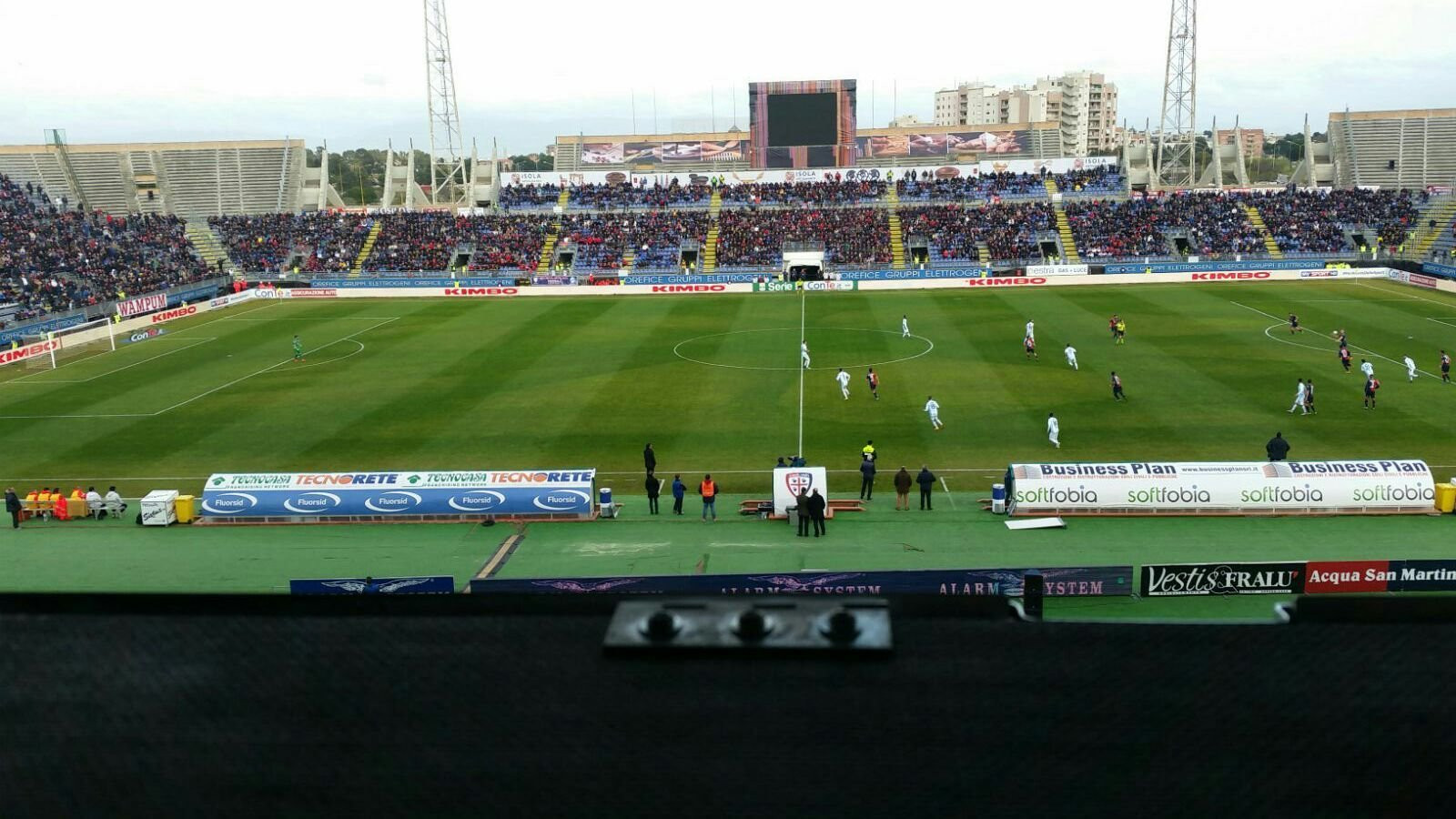 Voglia di riprendersi il primo posto e di salutare nel migliore dei modi il ritorno al Sant’Elia del capitano Daniele Dessena. Avversario di turno la Virtus Entella che per il pubblico di Cagliari vale come la Juventus e il Milan vista la solita, massiccia presenza. Per Rastelli consueto 4-3-1-2, con, a centrocampo, il debutto di Cinelli dal primo minuto e nuova chance per il giovane Deiola. In attacco, un po’ a sorpresa, Alberto Cerri. Aglietti risponde con il suo 4-3-1-2: Caputo-Masucci di punta sostenuti da Costa Ferreira sulla trequarti. Inizio a ritmi non altissimi e poche occasioni. Al sedicesimo un tiro di Farias infiamma il pubblico, ma è un fuoco di paglia. Qualche sbadiglio dagli spalti, ma il sostegno non manca. Masucci al trentesimo ricorda ai circa 12 mila del Sant’Elia che l’Entella c’è e non si gioca i play-off per caso. Il primo tempo si chiude senza grandi emozioni.