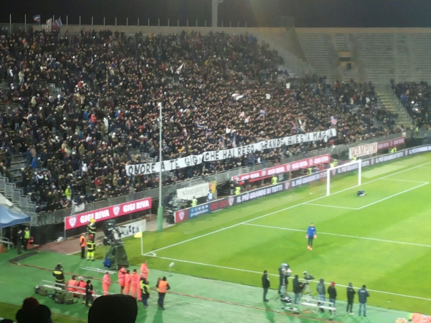 “Onore a te che hai reso grande questa maglia”. A Cagliari, prima della partita contro la Juventus, si celebra il mito di Gigi Riva. “Rombo di tuono” ha infatti ricevuto direttamente da Giovanni Malagò il Collare d’oro al merito sportivo, un prestigioso riconoscimento alla carriera. “Voglio ringraziare il presidente del Coni per essere venuto di persona qui a consegnarmi il premio. E poi vorrei salutare le mie nipotine che sono qui in tribuna: purtroppo sono tutte femmine, quindi nessun futuro calciatore”. Ha gli occhi lucidi Gigi Riva, che diventano sorpresi quando Buffon interrompe il riscaldamento per abbracciarlo. Accade lo stesso anche con Dessena, capitano del Cagliari. Poi il tributo della curva: Gigi Riva si prende gli applausi di quel popolo che lo ha amato e di cui è diventato, per sempre, icona.