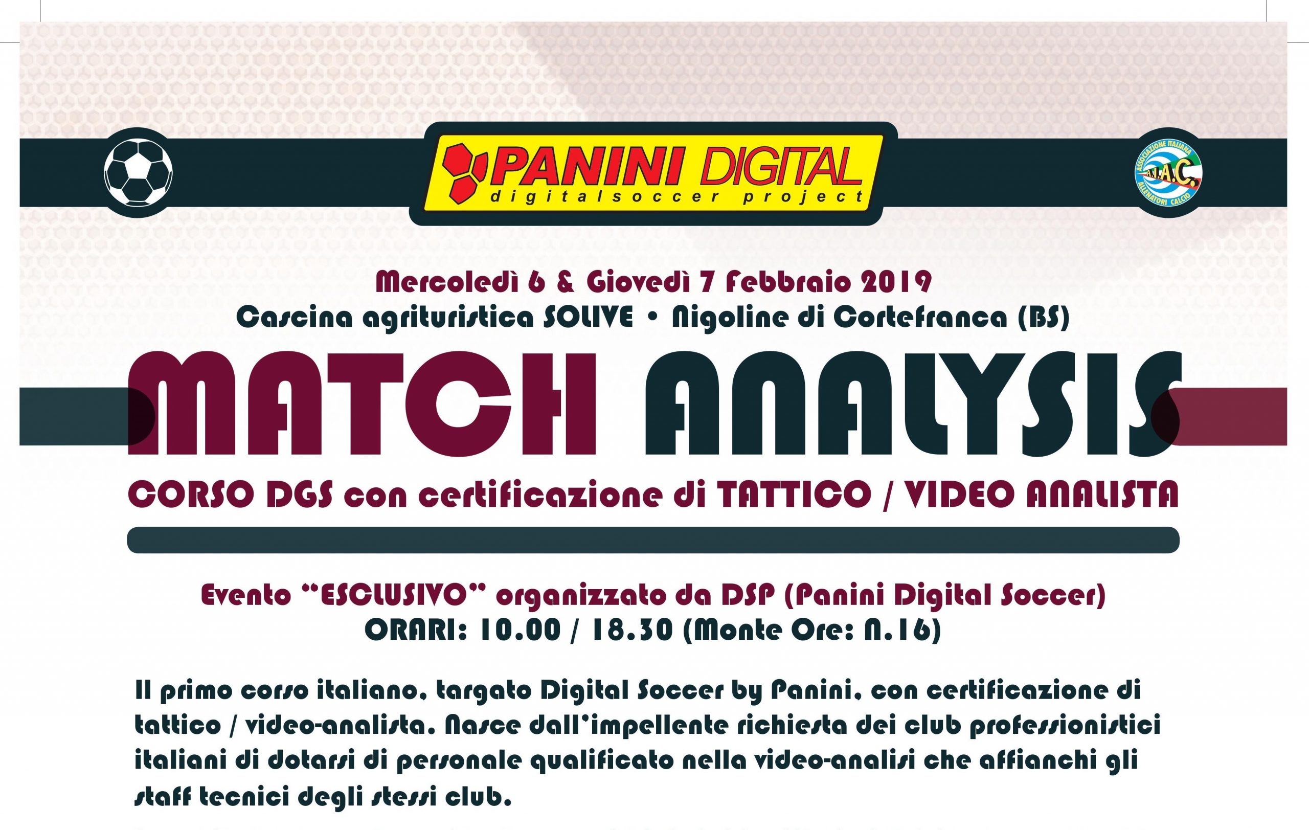Gli appuntamenti sono fissati per mercoledì 6 e giovedì 7 febbraio 2019 presso la Cascina agrituristica Solive di Nigoline di Cortefranca (BS). Al termine della partecipazione verrà attestata la partecipazione al corso con tanto di iscrizione al primo “Elenco Panini Digital” con certificazione di tattico/video analista della Panini Digital Soccer. Non solo, sarà anche possibile avere la licenza e l’installazione del sistema DigitaLog gratuita per 6 mesi e riconoscimento di uno sconto del 50% sull’acquisto finale del software.