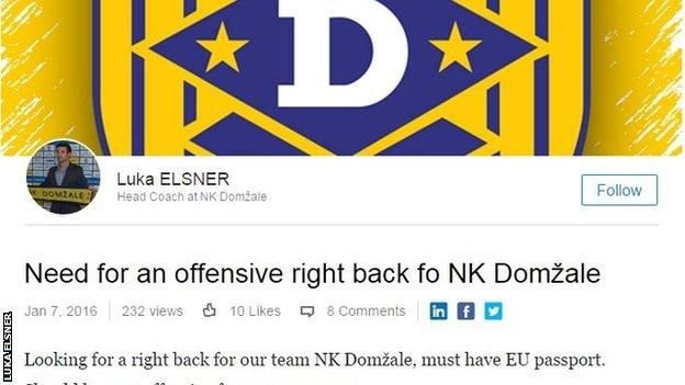 In Slovenia, Luka Elsner, giovane allenatore 33enne del Domzale (squadra che milita nella massima serie slovena), ha pubblicato questo annuncio: “Abbiamo bisogno di un terzino destro offensivo”. E nel dettaglio della descrizione del singolare annuncio ulteriori specifiche in merito al professionista ricercato: “Deve avere passaporto europeo ed essere davvero offensivo per inserirsi nel nostro modulo 3-4-3”. Iniziativa sicuramente inedita, ma che ha dato i frutti sperati.