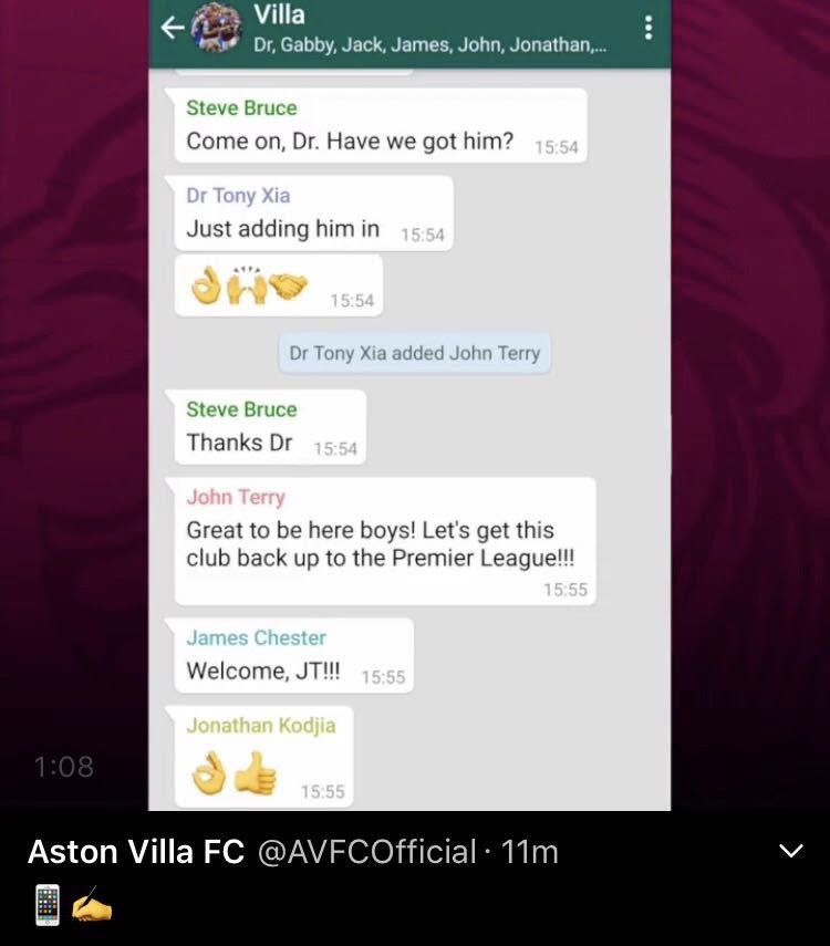 Non solo, i ‘Villans’ hanno anche annunciato l’arrivo dell’ex capitano del Chelsea attraverso una particolarissima grafica apparsa sui propri canali social ufficiali che simulava una chat whatsapp: ecco la foto.