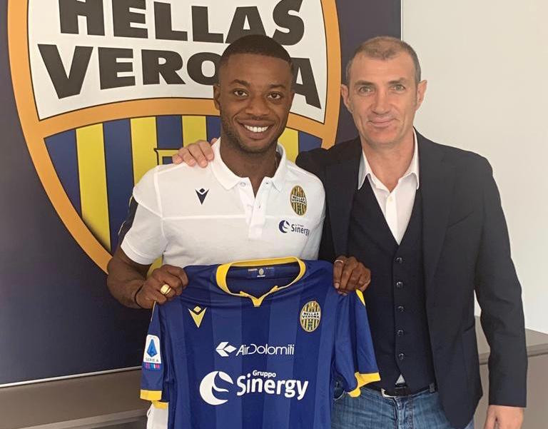 Adesso è ufficiale: Claud Adjapong è un nuovo giocatore del Verona. Il club gialloblù ha ufficializzato l'arrivo del giocatore con un comunicato. Il terzino destro classe '98 arriva in prestito gratuito dal Sassuolo con diritto di riscatto. Il giocatore sta già svolgendo le visite mediche. In foto Adjapong con la maglia del Verona insieme al suo procuratore Pietro Parente.