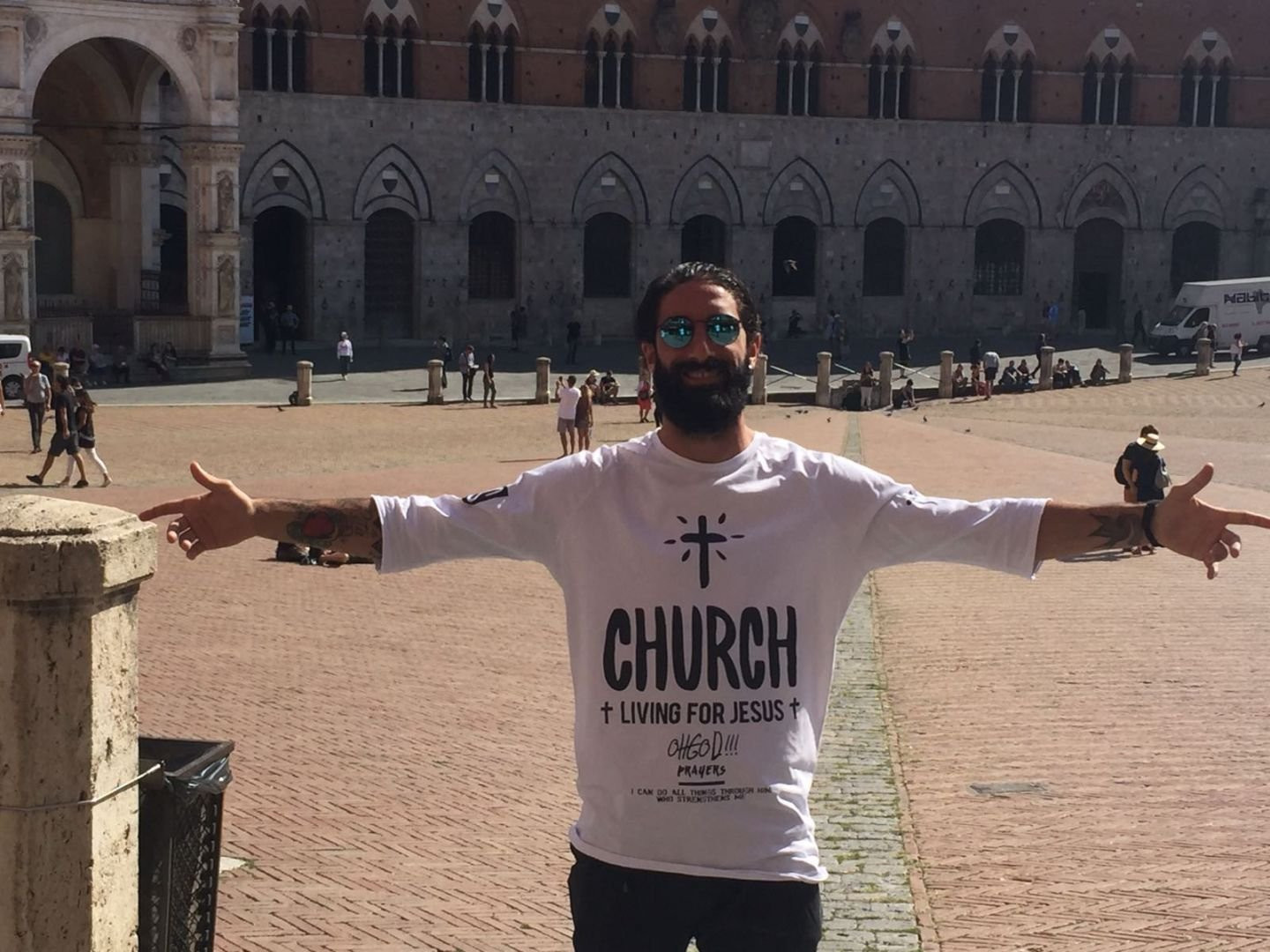 Ne ha girate tante di squadre, Siena è la sua diciassettesima, ma una Piazza così bella non l’aveva mai vista. La osserva, qualche battuta…anche sulla sua barba! “L’ho sempre portata, ma mai così lunga. Mi annoio a tagliarla, ma piace a mia moglie e questo è l’importante, sbaglio? Ah, nessun confronto con Moscardelli eh! Lui ce l’ha dieci volte più lunga, è fuori classifica”. Quando parla dei suoi tatuaggi, invece, cambia voce, si emoziona anche un po’: “La maggior parte sono riferiti alla mia famiglia. Sono un tipo molto passionale…anche in aria di rigore!”.