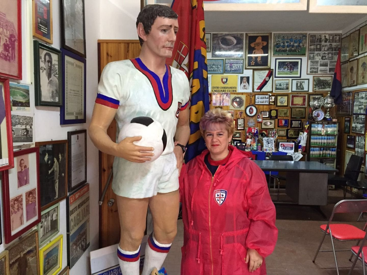 Ma non è tutto, perché per Milena il Cagliari è una vera e propria ragione di vita. Casa sua è a tutti gli effetti un tempio rossoblù: dai tappetini sull’uscio di casa alla camera da letto interamente con i colori della sua squadra del cuore. “E da quando i miei figli sono andati via di casa la loro cameretta è diventata quella di cimeli”. Ne ha di tutti i tipi, non solo le semplici magliette, ma anche bottigliette, portachiavi, peluche, e chi più ne ha più ne metta. Per non parlare dell’abbigliamento indossato nel giorno della partita del Cagliari. “Si parte dalle calze, che sono sempre una rossa e l’altra blu, poi la maglia che è sempre la stessa ed è quella firmata da tutti i giocatori, impermeabile, orecchini dei due colori della squadra e anche il trucco. Non lascio nulla al caso”. E come se non bastasse, poi, al collo porta una collana con la scritta “Cagliari”.