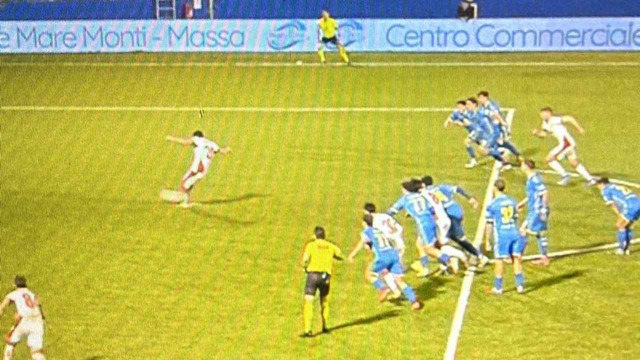 Dal dischetto si presenta Simone Pontisso, ma il suo tiro viene respinto da Bleve. L’azione però non si chiude: dopo la revisione al Var, Dionisi decide di far ripetere il penalty per l’ingresso anticipato in area di diversi giocatori della Carrarese prima della battuta.