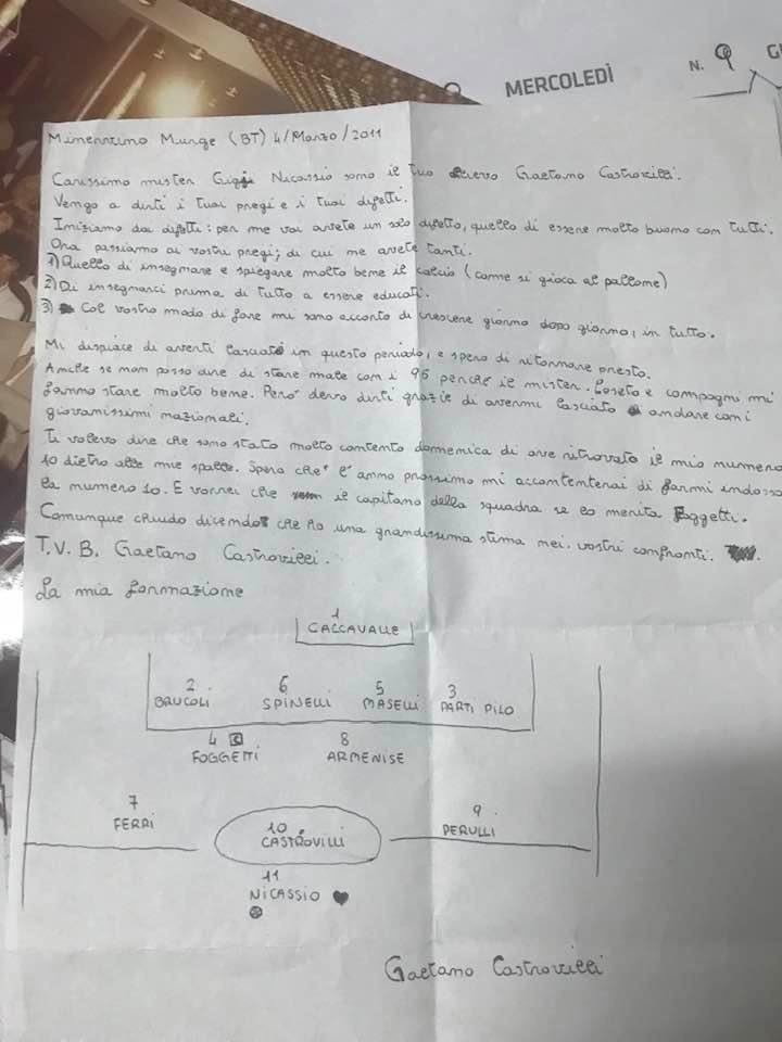 È allora che il talento di Minervino Murge decise di scrivere una lettera rivolta a Gigi Nicassio, che nella stagione in corso era il suo allenatore. "Carissimo mister Gigi, sono il tuo allievo Gaetano Castrovilli – è il testo della lettera pubblicata su Facebook dallo stesso Nicassio – mi dispiace di averti lasciato in questo periodo anche se non posso dire di stare male con i '96 perché il mister Loseto e i compagni mi fanno stare bene".