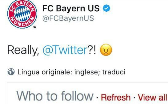Ha vinto il campionato ma l’eliminazione dalla Champions League ancora non è andata giù al Bayern Monaco. Quei 6 gol incassati dal Real tra andata e ritorno nei quarti di finale non sono facili da digerire per i bavaresi che hanno tanto recriminato anche per alcune ‘sviste’ arbitrali nel ritorno di Madrid. E Twitter sembra voler continuare a mettere il famoso dito nella piaga, suggerendo al profilo ufficiale dei bavaresi chi seguire, ovvero… Cristiano Ronaldo! “Davvero, Twitter?!”, la replica del club via social, un po’ piccata ma anche molto ironica.