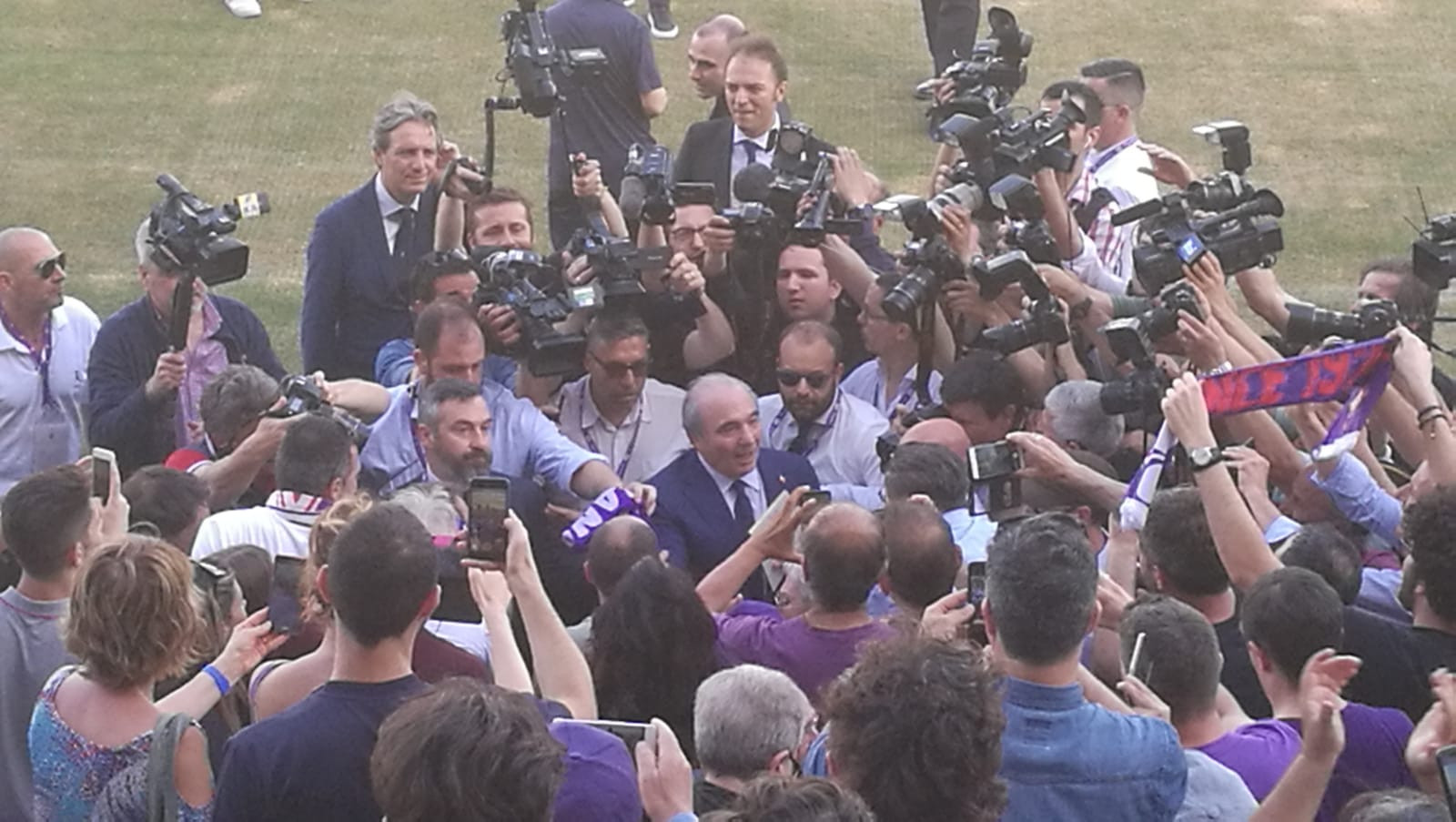 Dopo la presentazione, ecco l'abbraccio definitivo della città. Commisso ha messo piede al Franchi, si è girato e si è goduto alle sue spalle una tribuna completamente piena per lui. Bandiere americane, striscioni e tante maglie viola. Come la bandiera che gli viene consegnata sul palco allestito per l'occasione e che non esita a sventolare.