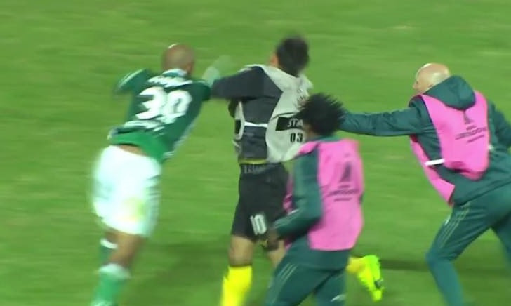 Maxi rissa al fischio finale di Penarol-Palmeiras, gara valevole per la quarta giornata di Copa Libertadores. Il protagonista principale dell’accesa lite è Felipe Melo, passato quest’estate dall’Inter al club brasiliano. Il centrocampista al triplice fischio dell’arbitro, dopo la vittoria della sua squadra per 2-3, ha provocato qualche calciatore avversario scatenando una rissa che ha finito prima per coinvolgere tutti i calciatori in campo e poi i tifosi delle due squadre sugli spalti. Melo ha colpito con un pugno Matias Mier del Penarol, per poi essere scortato dai compagni negli spogliatoi. Il Palmeiras guida ora il gruppo E con 10 punti.