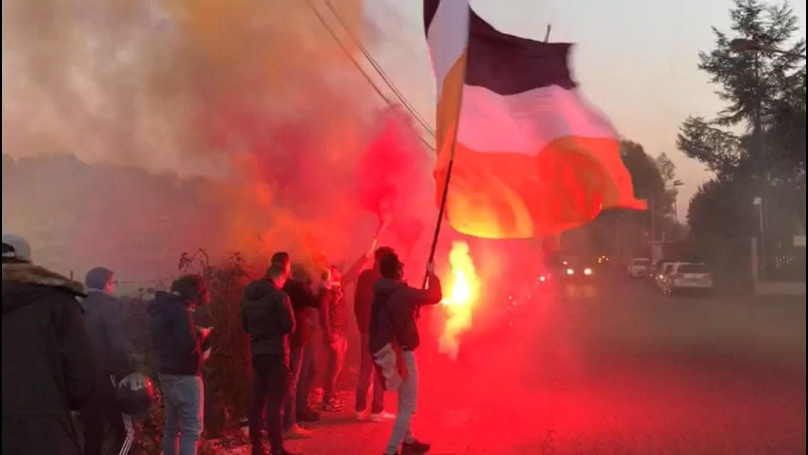 Questa sera la sfida tra Lazio e Roma per l’andata delle semifinali di Coppa Italia, ma il cuore più caldo del tifo giallorosso anche in occasione di questo derby diserterà lo Stadio Olimpico. Le motivazioni sono ormai note e nemmeno l’abbassamento delle barriere ha cambiato la linea di pensiero della Curva Sud. Per questo motivo parte del tifo romanista ha voluto far sentire comunque il proprio sostegno alla squadra. Appuntamento nel tardo pomeriggio fuori dai cancelli di Trigoria, poco prima della partenza del pullman della squadra. Cori, fumogeni e bandiere al vento per i quasi 50 tifosi presenti. Ora l’appuntamento è alle 20.45 per il calcio d’inizio. Fuori dallo stadio ma “con la Roma in fondo al cuor”. Ecco le foto.
