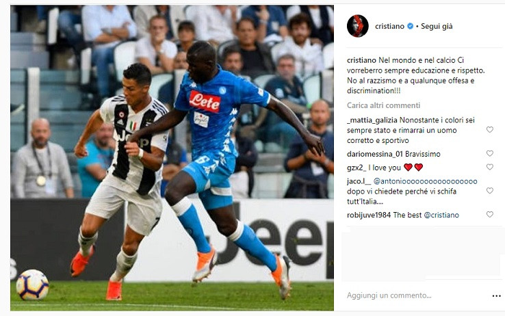 Cristiano Ronaldo si schiera con Kalidou Koulibaly. L’attaccante della Juventus, tramite Instagram, ha espresso vicinanza nei confronti del difensore senegalese del Napoli dopo gli episodi di San Siro. “Nel mondo e nel calcio ci vorrebbero sempre educazione e rispetto. No al razzismo e a qualunque offesa e discriminazione!!!”.