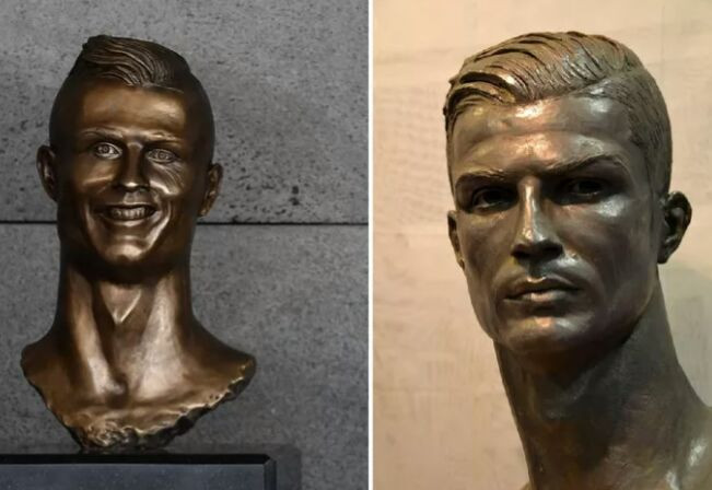 Da marzo a novembre. Bastano otto mesi per cambiare fisionomia. Niente ritocchini però, si parla del busto in bronzo di Cristiano Ronaldo. Una prima scultura di CR7 (nella foto sulla sinistra) era stata infatti realizzata lo scorso marzo dallo scultore portoghese Emmanuel Santos ed esposta all’aeroporto di Madeira, città natale del campione del Real Madrid. Un gesto di ‘venerazione’ sportiva che però presto è diventato motivo di scherno visto il volto dello stesso Ronaldo che è sembrato a molti da subito poco fedele all’originale. E in questi casi il web non perdona: meme, tanti rimandi alla statua di ‘Art Attack’ per la somiglianza e non solo. Niente di personale contro CR7, ma quel bronzo davvero non è stato mai lasciato in pace e ha provocato spesso più ilarità che ammirazione.