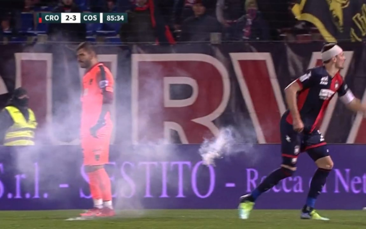 Infatti, sono stati lanciati tre fumogeni sul terreno di gioco, ed è stato il difensore del Crotone Golemic a occuparsi di spostarli a bordocampo. La sospensione è durata circa un minuto, poi la gara è ripresa e i rossoblù hanno anche trovato la rete del pareggio per il definitivo 3-3.