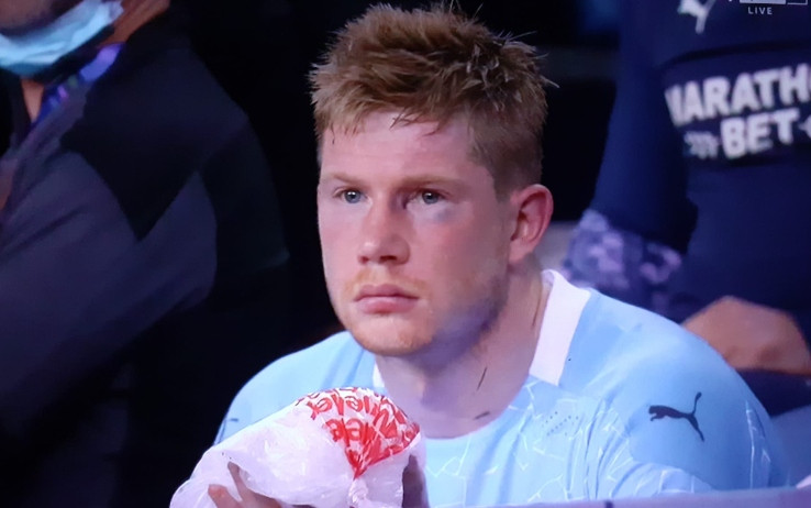 Che il colpo subito al volto non fosse di lieve entità si era capito subito, visto che De Bruyne è uscito dal campo visibilmente stordito e sorretto dallo staff medico del Manchester City.
