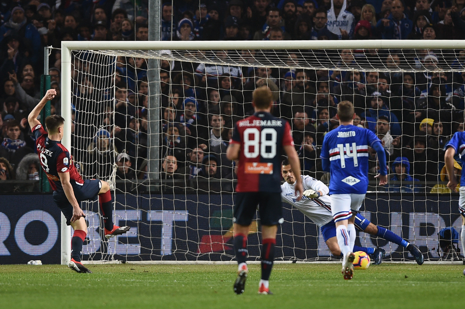 Sud che esplode, quinto gol in campionato per il numero 27, il cento trentaduesimo in A: derby che si sblocca subito, con il solito Quaglia a richiamare immediatamente la squadra a centrocampo perché “c’è ancora tanto da giocare”. E al Genoa per azzerare tutto bastano appena nove minuti: palla in profondità per Piatek, errore di Andersen che si lascia superare dall’attaccante polacco, steso in area da Audero. Arbitro che indica il dischetto: palla da una parte, numero uno della Samp dall’altra, dopo 451’ il pistolero torna a sparare. Decimo gol in campionato per il capocannoniere solitario della Serie A, fermo dalla rete nel ko col Parma dello scorso sette ottobre che costò l’esonero a Davide Ballardini. Primo gol sotto la gestione Juric, espulso per proteste nella ripresa, quattordici in altrettante gare ufficiali, poker di Coppa Italia compreso.