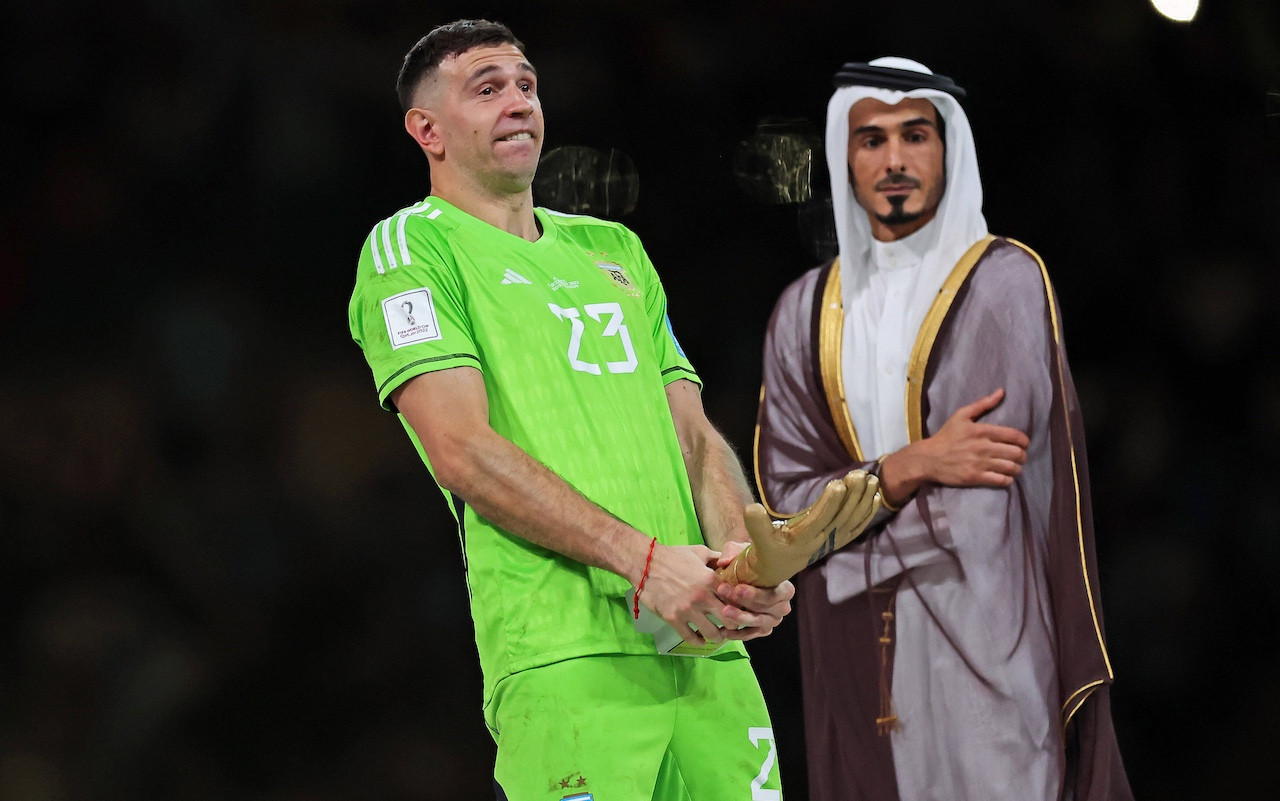 La scena proposta alla premiazione per il Golden Glove di Qatar 2022, in realtà, ha un precedente pressoché identico e non bisogna tornare molto indietro nel tempo per ritrovarlo. Serve tornare giusto al 2021, alla premiazione immediatamente successiva alla finale della Copa America, anche lì vinta ai rigori, in casa del Brasile. Stesso esito, stesso premio, stesso gesto.