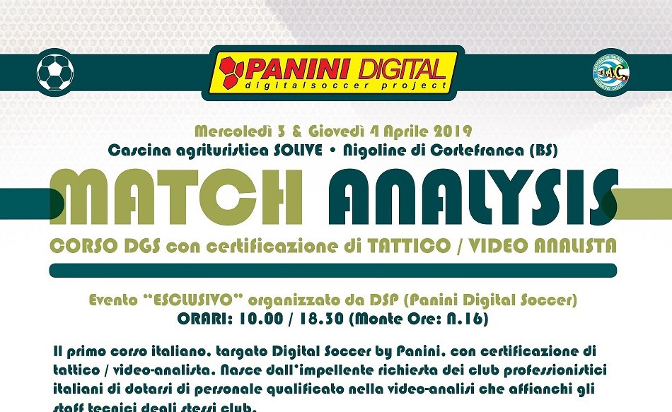 Gli appuntamenti sono fissati per mercoledì 3 e giovedì 4 aprile 2019 presso la Cascina agrituristica Solive di Nigoline di Cortefranca (BS). Al termine della partecipazione verrà attestata la partecipazione al corso con tanto di iscrizione al primo “Elenco Panini Digital” con certificazione di tattico/video analista della Panini Digital Soccer. Non solo, sarà anche possibile avere la licenza e l’installazione del sistema DigitaLog gratuita per 6 mesi e riconoscimento di uno sconto del 50% sull’acquisto finale del software.