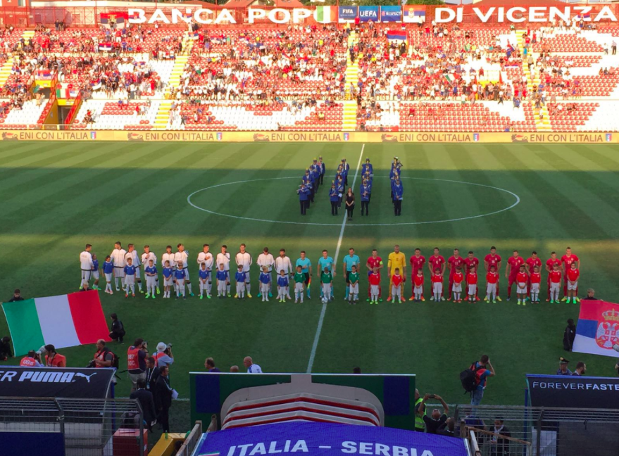 La partita probabilmente decisiva per la qualificazione al prossimo Europeo Under 21, quella contro la Serbia, si gioca a Vicenza, città del Veneto che vanta una comunità serba di 2.878 anime. Di questi, circa duemila sono al Menti. Ecco perché per tutta la durata del match sembra che a giocare in casa siano loro. I serbi in tribuna, oltre ad essere tanti, sono anche rumorosi: spingono la nazionale perché sanno che vincere a Vicenza vorrebbe dire aprirsi un’autostrada verso la Polonia (paese ospitante del prossimo Europeo). Come all’andata: Serbia in vantaggio(Gajic sul finale di primo tempo) e Italia costretta a rincorrere. Non solo dal punto di vista del punteggio, ma soprattutto da quello del gioco. Gli azzurrini soffrono la corsa e la reattività degli avversari. Le assenze di Berardi in avanti e Rugani in difesa si fanno sentire, non tanto sulle gambe quanto sulla personalità in campo. I due attaccanti messi dentro da Di Biagio, Cerri e Rosseti, sono lì davanti abbandonati al loro destino. Questo perché il ct azzurro al falso nueve (in campo di fatto ne mette addirittura due), preferisce il falso sette! Né Benassi né tanto meno Verre sono esterni naturali, motivo per il quale scarseggiano i rifornimenti alle due punte. Da questo punto di vista l’ingresso in campo nella ripresa di Di Francesco si rivela una vera scarica di adrenalina per l’attacco azzurro che infatti proprio nella seconda frazione si rianima, trova il pari (rigore procurato da Rosseti e trasformato da Cerri) e sfiora anche il colpaccio, prima con Romagnoli sugli sviluppi di un calcio d’angolo, e poi proprio con Di Francesco che da zero metri calcia addosso a Milinkovic Savic.