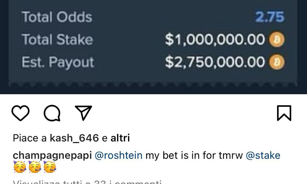 La vittoria dell’Argentina è infatti quotata 2,75 la posta scommessa dalla ricevitoria utilizzata da Drake, che ha annunciato al mondo il suo azzardo con un post su Instagram.