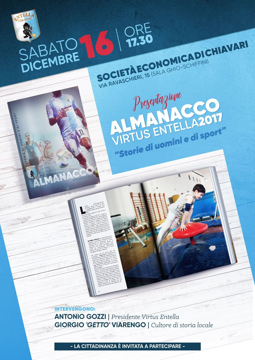 Dopo l’edizione del 2015 e 2016, anche quest’anno l’Entella presenta il nuovo Almanacco, in vendita a partire da lunedì. Un’edizione, quella di quest’anno, dedicata oltre all’Entella stessa (con l’organigramma societario, lo staff, la rosa della prima squadra, il settore giovanile e i risultati della stagione passata) e al Tigullio, anche al ricco panorama delle società sportive chiavaresi con le foto realizzate dal Gruppo Fotografico DLF Chiavari. Quindi non solo calcio. A tal proposito è stata allestita la mostra fotografica “Storie di Uomini e di Sport”, la cui inaugurazione è prevista per domenica 10 dicembre alle ore 17,30 presso l’Auditorium San Francesco di Piazza Matteotti a Chiavari e potrà essere visitata fino a sabato 23 dicembre. Invece la presentazione dell’Almanacco è prevista per sabato 16 dicembre alle ore 17:30 presso la ‘Società economica di Chiavari’ in Via Ravaschieri 15 (Sala Ghio-Schiffini), dove interverranno il presidente biancoceleste Antonio Gozzi in persona e Giorgio ‘Getto’ Viarengo, importante cultore di storia locale. Come da consuetudine quando si parla di Entella, sport e beneficenza si intrecciano: il ricavato della vendita di questa iniziativa editoriale verrà donato all’Ospedale Pediatrico Gaslini di Genova. Potrete trovare ulteriori informazioni sull’Almanacco ed altre iniziative su Chiavarinrete.it, l’ultima iniziativa di Sabina Croce, moglie del presidente Gozzi da sempre impegnata nel sociale: un portale dedicato a tutte le iniziative chiavaresi, aperto alle associazioni solidali, culturali e sportive.